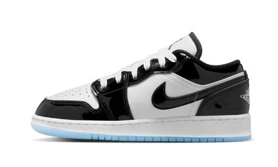 The Jordan 1 Low SE Concord’s draw inspiration from the Air Jordan 11 Concord, highlighted by the sneakers combination of black patent leather, and white leather uppers.